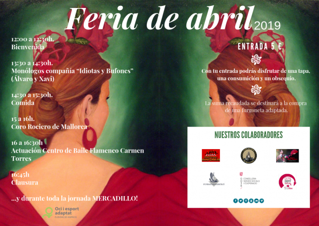 El próximo 27 de abril, de 12 a 17h, Fundació ASPACE celebrará la esperada Feria de abril en las inmediaciones del centro (Ctra, Vieja de Bunyola Km 8,2, Marratxí) en un acto abierto al público. La entrada tendrá un coste de 5 euros e incluirá una consumición, una tapa y un obsequio. Estos tiquets se podrán adquirir a partir del 1 de abril en Secretaría de ASPACE (de lunes a viernes de 9 a 17h) o el mismo día del evento.