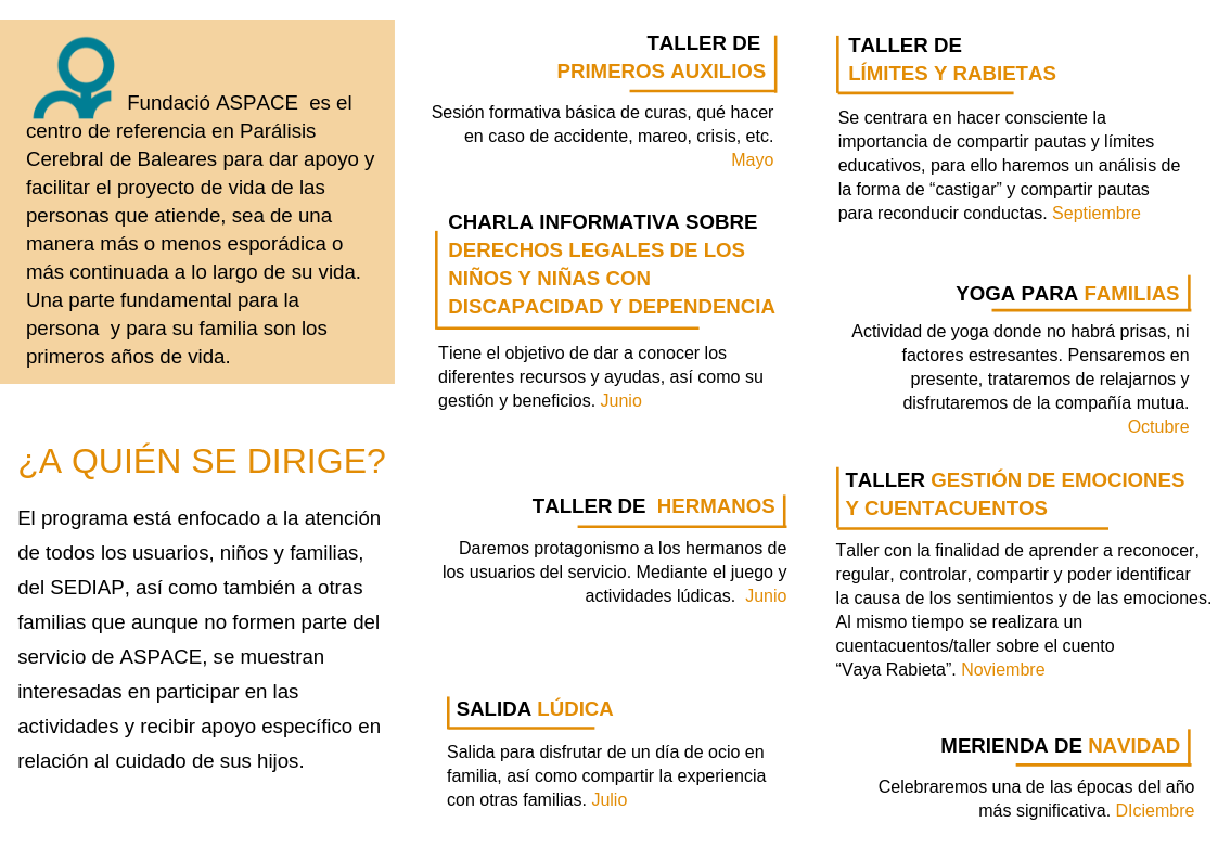 El servicio de Atención Temprana de ASPACE lanza el programa de formación a familias enfocado a la atención de todos los usuarios, niños y familias del SEDIAP, así como también a otras familias que aunque no formen parte del servicio de ASPACE, se muestran interesadas en participar en las actividades y recibir apoyo específico en relación al cuidado de sus hijos.
